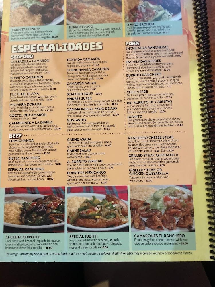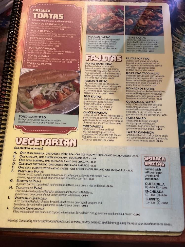 El Ranchero's menu is extensive, featuring a variety of traditional Mexican dishes. Appetizers like Texas nachos and guacamole kick off the meal, tempting diners with bold flavors. The menu includes hearty choices such as burritos, tacos, and fajitas in various styles, satisfying all cravings. The seafood selection, highlighted by dishes like quesadilla camarón, offers fresh flavors for those looking for a lighter option. Vegetarians can find tasty and fulfilling meals as well.